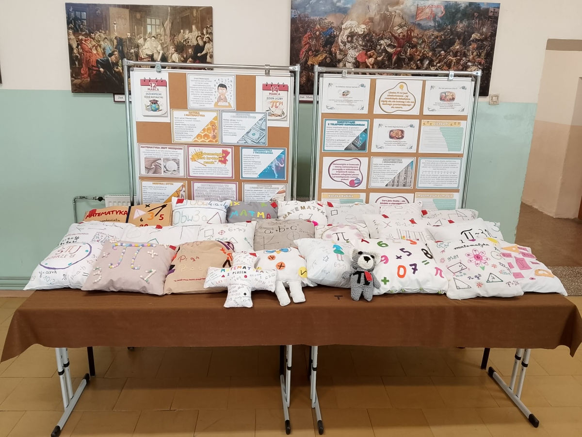 W ramach obchodów zorganizowano również konkurs „Matematyczna poduszka”. Zadaniem uczestników było uszycie poduszki z motywem matematycznym. Konkurs cieszył się ogromnym zainteresowaniem – otrzymaliśmy aż 26 niezwykle pomysłowych i starannie wykonanych prac. Kreatywność uczniów przerosła nasze oczekiwania! Z wielkim trudem wybraliśmy trzy najciekawsze prace. Dzień Matematyki pokazał, że matematyka może być nie tylko nauką, ale także świetną zabawą i inspiracją do twórczego działania.